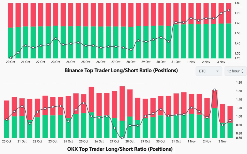 Específicamente, el ratio largo-corto de los traders principales en estos exchanges ha mostrado estabilidad a pesar de la corrección en el precio. Cuando este indicador permanece estable, sugiere que los traders con mayor poder en el mercado no están reduciendo sus posiciones de riesgo y, en cambio, confían en un cambio de dirección alcista.