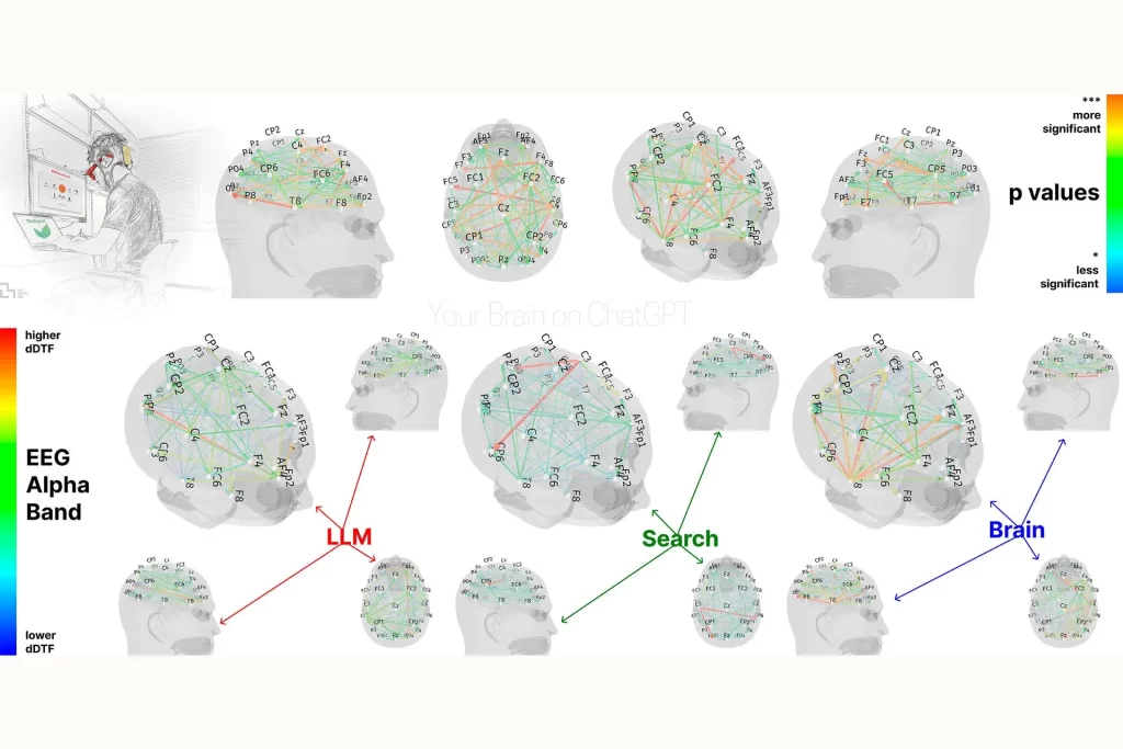 El grupo que escribió los ensayos sin ninguna ayuda tecnológica mostró la mayor conectividad neuronal, especialmente en las bandas alfa, theta y delta, asociadas con procesos creativos, memoria y comprensión semántica. Estos participantes se mostraron más involucrados, curiosos y satisfechos con sus trabajos, además de mostrar un mayor sentido de propiedad intelectual sobre los textos elaborados.