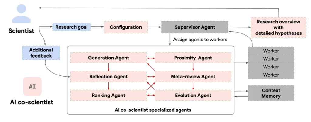 El sistema AI Co-Scientist está compuesto por un conjunto de agentes especializados, cada uno con una función específica dentro del proceso de investigación. Estos incluyen: